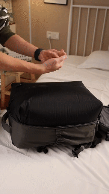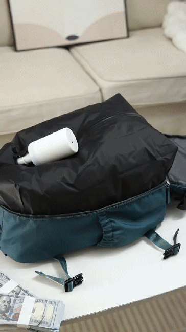 The built-in vacuum compression system removes excess air from your clothes in seconds — reducing the volume by up to 60%. Just pack, seal, and press the button. No extra tools needed.